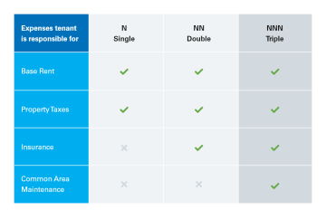 Hence these expenses are often categorized into the "three nets": i.e., property taxes, insurance, and maintenance. As illustrated in the table below, NNN leases are one of three (3) types of net leases together with single net leases and double net leases